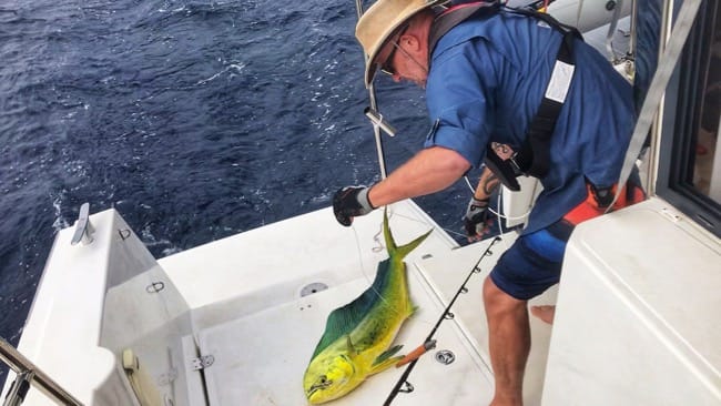Jen grabs the gaff and tries to hook the fish while I try to get it closer to the boat… but fair to say (like everything else) these are new attempts/skills for us and we’re trying to do so while underway… so we fail miserably. I eventually just grab the line and pull the huge beautiful fish aboard. We are both already tasting the sashimi, ceviche and fish tacos. I freeze monetarily, mostly struck by the intense color and beauty of this fish (he was iridescent- green, blue and yellow and impossibly beautiful) but also looking around me for the pliers to remove the hook and a line to tie onto and secure the fish. That pause of merely a few seconds would turn out to be more than enough time for the fish to slap once against the deck, spit the hook out and slip just inches outside my grasp and back into the sea.
