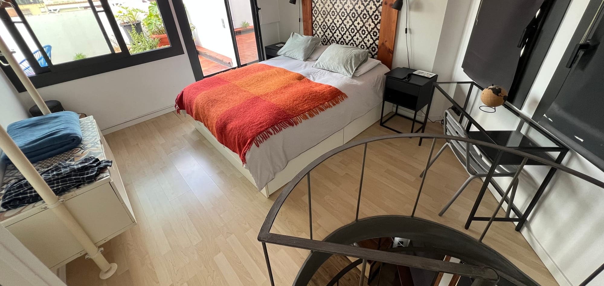 When we saw the word “attic” in the listing, we figured we’d be crammed under some low beams. Instead, we stepped into a light-filled penthouse with its own spiral staircase and two balconies overlooking the city.