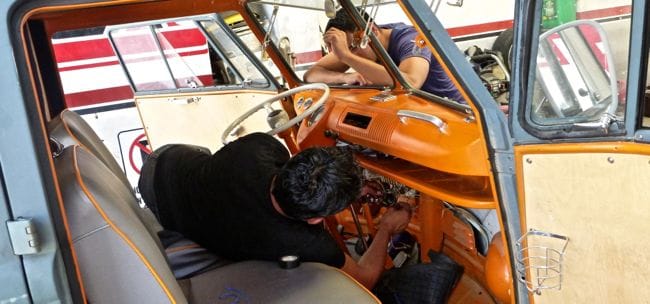 The rest of the afternoon is spent at one of Rogelio's friend's shops getting a radio installed. We have been driving E without tunes for years since we ripped out the original interior) but the hours we now spend in the bus has moved this from want to need. After hours spent by the guys in the shop making our old radio work and the difficult installation (into an old split bus that was never designed for such amenities); the bill is $60...far less than it would have cost us to either fix or replace just the radio in the states. Why again didn't we do all our shopping here before?