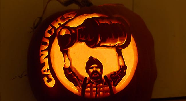 Just before Halloween the Canucks post on facebook that they are giving away game tix for the best carved pumpkin with a canucks theme. We hadn't yet carved our pumpkin, so why not, right? Well...many of you also know that i also don't go small on these things, so fast forward three days (really three sleepless nights) spent carving johnny canuck into the side of a pumpkin and here we are.
