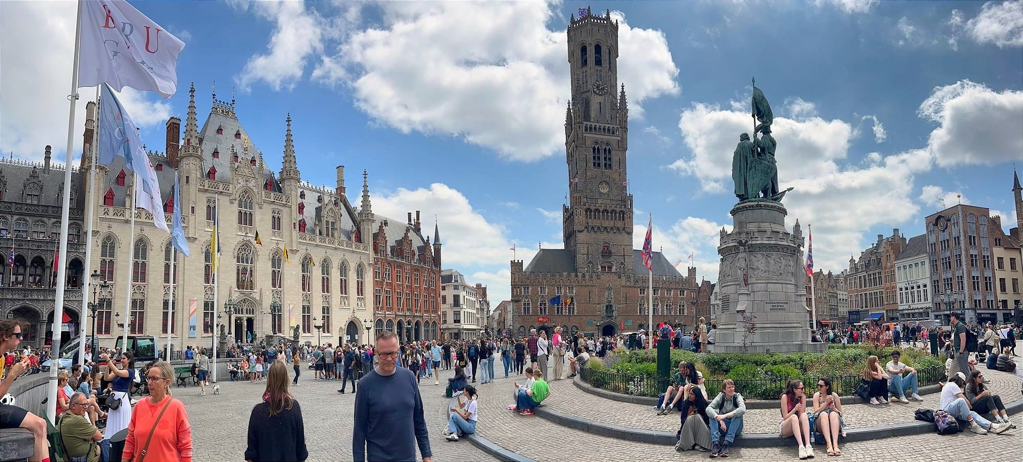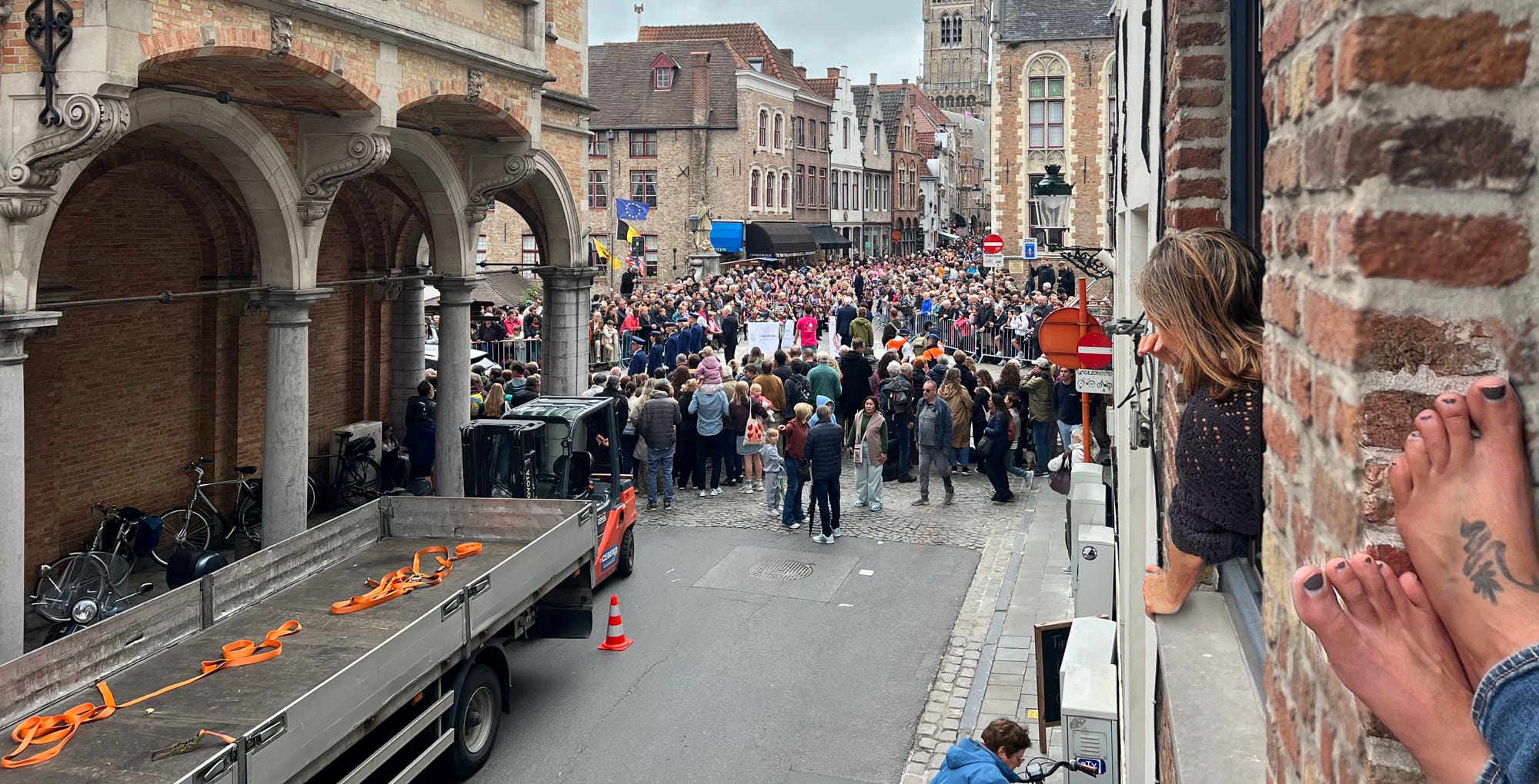 We got off in Bruges, tired from the trip but excited for our stay. We were immediately struck by the gorgeous historic structures, as our taxi tried to weave through the immense crowds in this town. It seemed like we were driving through Times Square on New Year’s Eve... there were SO MANY people that they were walking on both sidewalks and streets and still shoulder-to-shoulder on just about every street. Oh boy... what have we done?