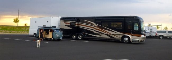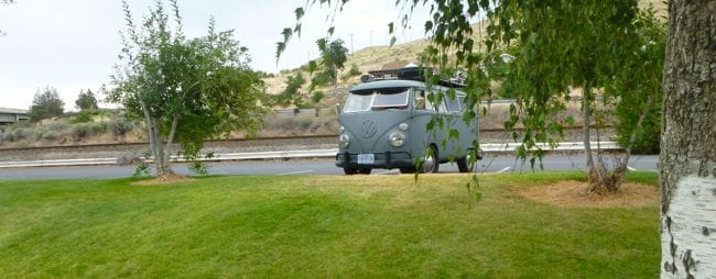 we had to pull off road in the heat of the day as we were worried the bus would start running too hot, but it was a welcome rest for all of us sitting under a shade tree in the park. the temp started dropping as we hit the road again and we decided Pendleton was far enough for our first day. We had to make the call between the local rv park, the walmart parking lot (which we understand always allows campers, but doesn't hold much appeal to us) and the local casino…no contest. Tried our hand at the craps table, which was abysmal, had a drink while watching the comedy show and then out to the bus for dinner.