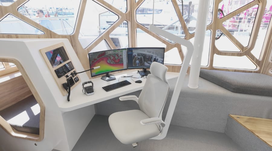 Imagine a 50-foot boat constructed from eco-friendly materials, silent electric drives, a wide open floor plan like we've grown used to on svKarma, AND with the helm INSIDE and protected at the front of the boat!