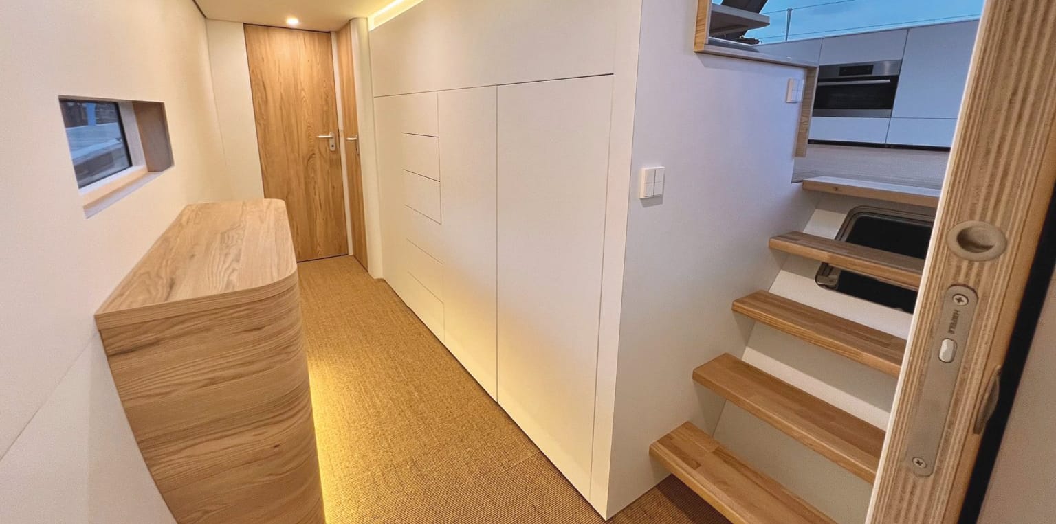 But the real change that stuck with us was the folding transoms (the exposed helm position felt like a hurdle for us even when trying to dodge a pandemic) and the attention to small details stood out. A water catchment system being thoughtfully integrated into the roof and funneling directly into a dedicated water tank. A deeper/longer tour also showed off many other clever details with a focus on saving weight (down below, each door actually serves two purposes depending on current need/use - brilliant)!