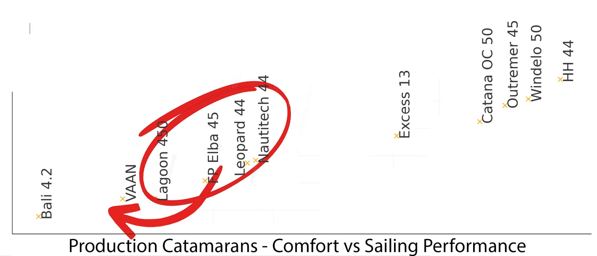 Effectively, you've got a small handful of performance cats in the top right (all also well over a million dollars as a liveaboard-ready boat), with most of the other production brands seemingly running to join Bali in the comfort corner.
