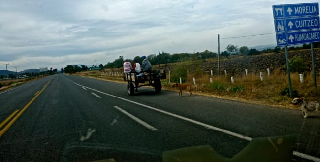 Further on, we turn north off the cuota toward the reserve. There are actually several reserves in the area, but only a few are open to the public. Apparently we chose poorly. We roll into this tiny town and start asking around but nobody seems to know who to talk to or how to arrange a visit to the monarchs. We were hoping to see the butterflies today and hit the road early, but after 45minutes of deliberation between the policia and other locals someone seems to know that the butterflies haven’t shown up at this spot yet this year. The policia have offered for us to park directly in front of the municipal building and that they will be standing guard all night, but we still think we might still make it to the other reserve and take off.