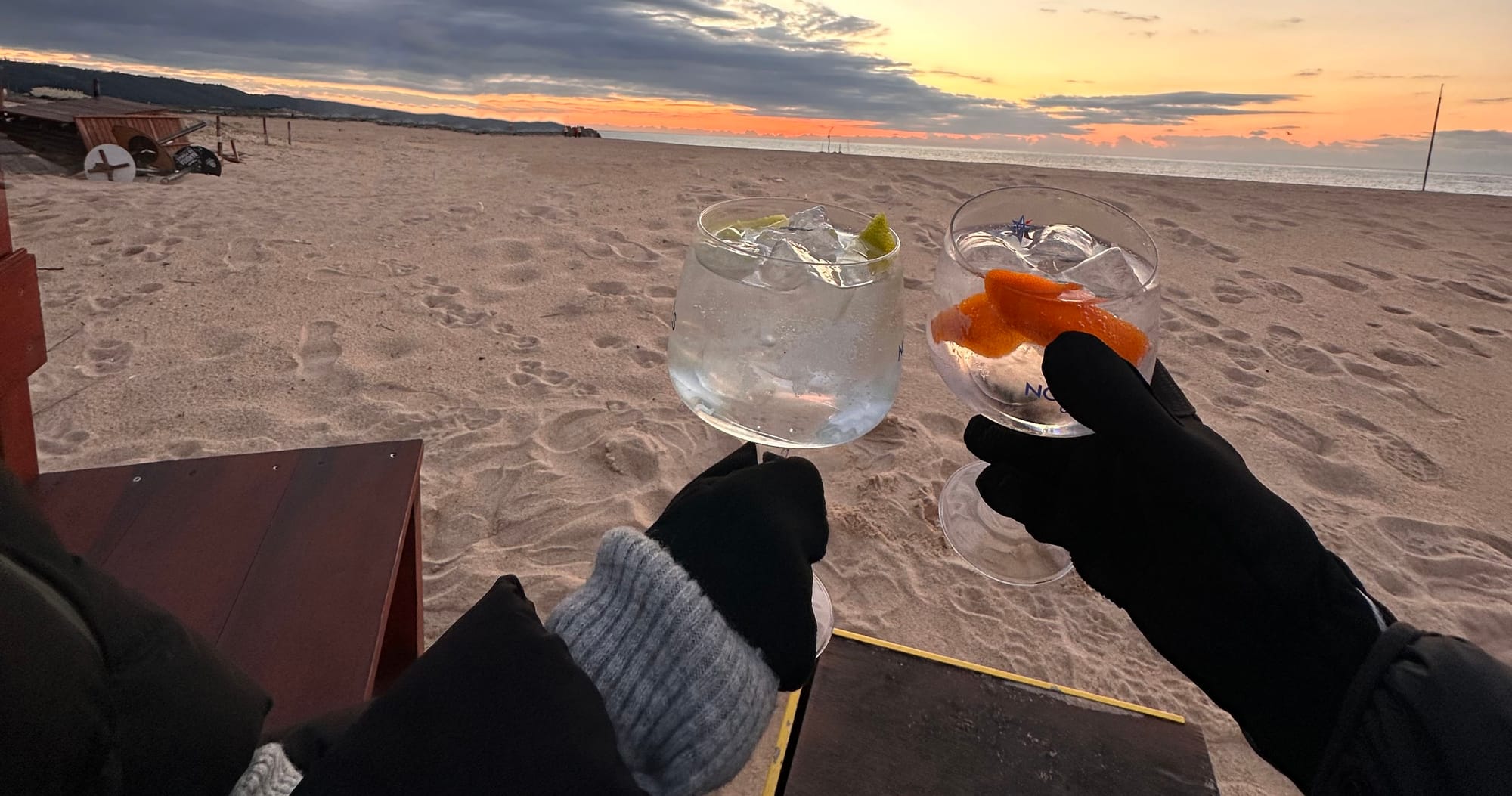 Obviously, most things were closed, but we walked along the esplanade from the marina to town, stopped to marvel at the stray cat townhouses erected along the way (this town loves their strays), and found the only establishment open for business, where we settled in for a G&T in the sand to watch the end of the sunset and toast/reflect on a job well done.