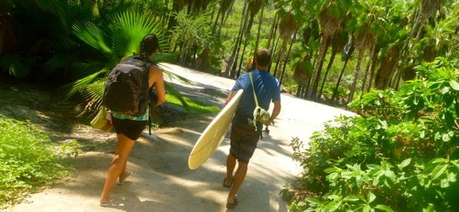 The walls around the yard made for a warm night, and we all wake up early and convene in the kitchen for coffee and breakfast. We talk for a while and them head to las palmas, a local playa named for a gorgeous grove of palm trees lining its beach. This is the first beach we haven't been able to park directly on or in front of, so we stash/lock everything up and stroll towards the ocean. The short hike reminded us of the approach to short sands (for those of you in portland) except you have to swap out sand and palms for old growth forest and ferns. It's clearly Sunday as the beach has a few local families playing in the water and throughout the day it fills in with more and more families and children playing in both the waves and the freshwater stream running to the sea.