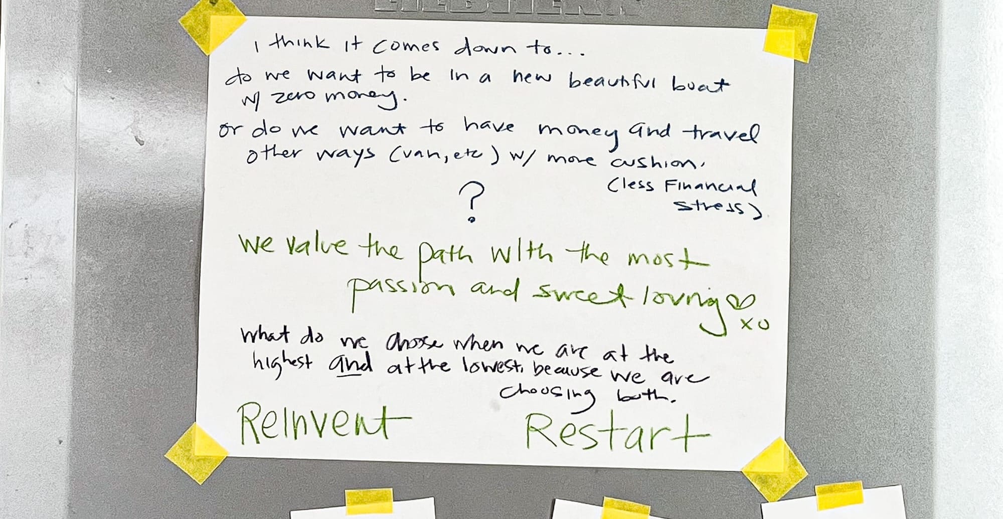 Which means - we've been doing a lot of talking, dreaming, goalsetting and generally trying to figure out where to go from here. A lot of whiteboarding was in order (except that we don't own one), so we ended up sticking all the thoughts/ideas/paths we could conceive of to the fridge so that we could live and interraxct with them for several days.
