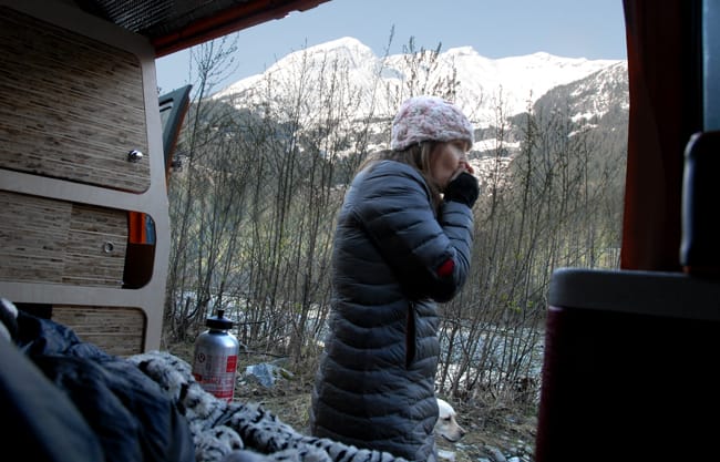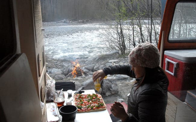 North of Squamish we had to make a call, explore Squamish river valley or Paradise valley. We chose Squamish river and took the left fork. We drove until the pavement stopped and started looking for good places to setup for the night. There weren't a lot of options and those that did exist were filled with fisherman and guys up riding their quads for the weekend. We drove until someone told us that the road ended a few km up (unmelted snow made the road impassable), so we turned around and went back to a pullout we saw a few km back. Wasn't a campsite, but there was large open space and an opening in the tress that made us feel like we were front and center at the river so it worked for us. We setup shop and made a nice fire and some dinner.