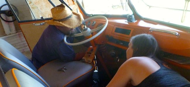 We got the bus started in the am, and backtracked 20 minutes to rick's house/shop. Rick buys/restores old VWs and muscle cars and his place is a regular wrecking yard/treasure chest of old cars and parts. Rick himself is also a treasure, although maybe a bit rough around the edges. Karma played with his dogs (including a chihuahua and wiener dog mix aptly named Chorizo) as we were entertained for hours with Ricks offcolor wit and sarcasm while tinkering with the starter, speedometer and ignition.Sadly, he didn't really solve our starting issue but confirmed our tests that the starter was fine, the ignition seemed to be working...and that the speedometer was indeed dead (which isn't a huge problem since slow is our only speed anyway, by since we have no fuel gauge...the odometer was our only way of approximating our fuel level).In addition to spending several hours with us in the heat on his day off, running us to the parts store and being generally amazing; Rick sent us off with a spare speedometer, a couple of books on fly fishing and refused to take more than a few bucks for gas to the store.Despite Rick's belief that the whole world has "gone granola...turned into a bunch of fruits, flakes and nuts", he's proof that there are a few good nuts left. VW guys are a rare breed, and we continue to be proud to be a part of this community. Hopefully one day we will know enough to pass on the torch and help others in need.For now we still have no idea what we;re doing, we aren't sure how far we'll make it...but we're back on the road.